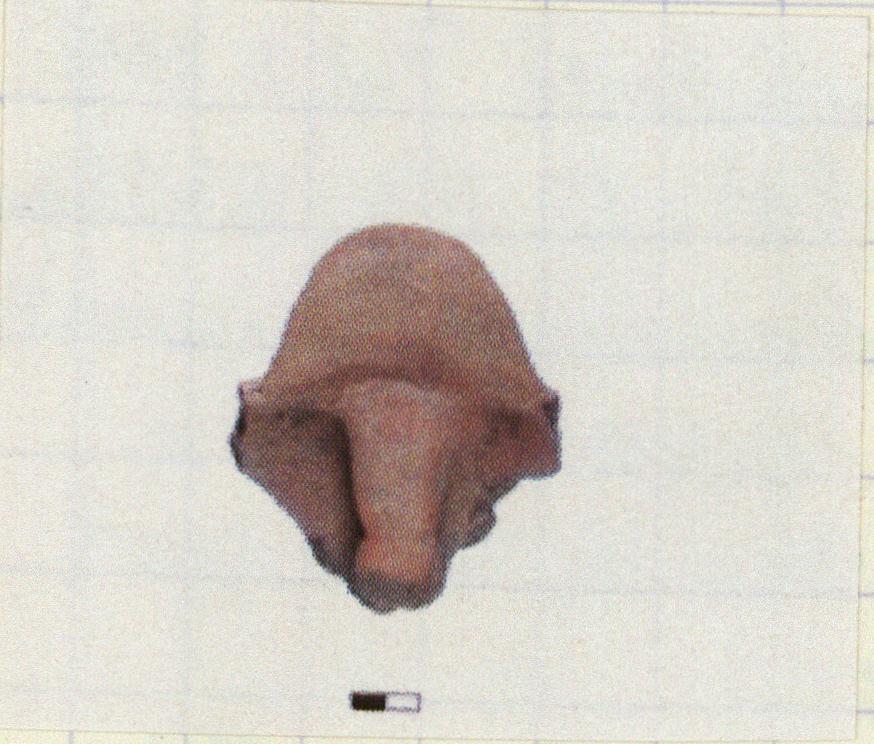 | Description: | Single fragment preserving panel, lug, and part of rim and upper wall. Tip of lug broken, edge of rim chipped. Hemispherical basin with projecting rim, convex on top. Broad handmade lug. Low semicircular panel, irregular behind and flaring out to edge of rim. Light red cooking fabric (5YR 6/8). Many large shiny white and mica schist inclusions. Hellenistic. | |