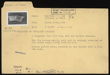 | Description: | Fragment from the rim, and one handle. The lip curves gently out and is sharply indented at its outer edge; heavy loop handle. Coarse yellow clay covered on the inside with a thin red wash. Unglazed. | |