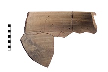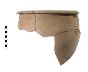 | Description: | Fragment from the upper part remains. High, almost vertical side wall; plain out-curved rim; the interior is decorated with intersecting horizontal and vertical striations. Coarse red clay, unglazed. | |