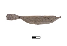 | Description: | Mended from six fragments. Missing section of rim with one handle. Slightly convex underside with string marks. Curving wall with outturned rim. Horizontal flat ribbon handle attached at rim. Circle of glaze inside at rim and another on floor. Fine buff clay. Red to brown glaze. Covered with soil which preserves textile fibers and structure. Cf. conservation report. | |