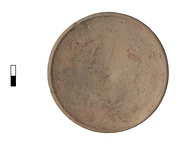 Description:   Pyre saucer. Intact. Base warped. Wall concave near base, convex at rim.
