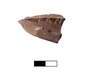 Description:   Single fragment from flat projecting rim of glazed open vessel (?), reserved on underside and outside edge of rim.
