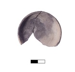 | Description: | Small pyre saucer. Mended from two fragments. About one third of rim and wall missing. Flat base with string marks. Slightly incurved rim. Unglazed; burnt. | |
