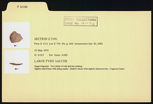 | Description: | Large pyre saucer. Single fragment. Two thirds of wall and rim missing. Slightly raised base with string marks. Shallow saucer with slightly thickened rim. Unglazed; burnt. | |