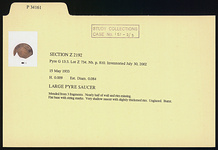 | Description: | Large pyre saucer. Mended from 3 fragments. Nearly half of wall and rim missing. Flat base with string marks. Very shallow saucer with slightly thickened rim. Unglazed. Burnt. | |