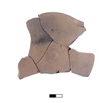 | Description: | Mended from 4 fragments. Three quarters of rim and both handles missing. Slightly raised base. Profile of rim very square. Unglazed. Traces of burning. | |