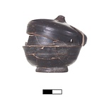 | Description: | Pyre lekanis. Body a) mended from 13 fragments; one third of rim and small part of body missing. Lid b) mended from 10 fragments; missing top of knob and parts of rim and wall. Ring foot. Rim inset to receive lid. Slightly domed lid with incurved rim; probably originally a profiled knob. Shiny black gloss; underside reserved. | |