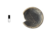 | Description: | Mended from five fragments, small piece of rim and wall missing. Burnt. Flat bottom with string marks. Shallow saucer with plain rim. Black gloss over all, clay partly burnt gray. | |