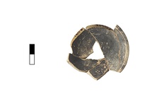 Description:   Mended from five fragments. Center of floor and three quarters of rim missing. Flat bottom with string marks. Shallow saucer with plain rim. Dull black gloss.