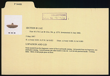 | Description: | Body mended from five fragments, center of floor and handle missing. Lid mended from six fragments, one small piece missing. Curved bottom; rim offset inside to take lid. Low lid with pinched handle. Cooking fabric. Blobs of dull purple glaze on floor. | |