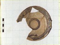 | Description: | Mended from nine fragments. Both handles and about one quarter of rim and wall missing. Small, slightly convex bottom with string marks. Fairly deep, very irregular plate with plain rim. Attachments for ribbon handles. Black gloss in band around edge of floor, in a circle at center, and on handles. Attic clay burnt brownish gray. | |