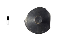 | Description: | Single fragment; two thirds of rim missing. Small Lekanis lid with well-formed, solid flaring knob. Shiny black gloss on exterior only. Attic fabric. Fragments of two more in lot Ω 103. | |