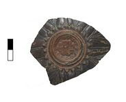 Medallion: eight-petalled rosette surrounded by alternating lotus petals and rays, all within two ridges and a scraped groove. Outer scraped groove with miltos below worn calyx of small pointed leaves. Wall: row of broad lotus petals. Crisp detail.