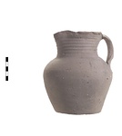 | Description: | About one-third of rim missing, otherwise complete. Two small neck fragments mended and plaster fill. Wide neck with everted lip slightly concave on top, trefoil mouth. Plum body. Flat base untrimmed. Wheel ridges on entire neck, lopsided ridged handle. Gray clay with numerous lime inclusions. Early 5th c. A.D. | |