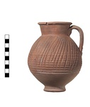 | Description: | Body intact, but chipped and cracked rim. Rounded out-turned lip. Vertical gouging on upper body, slanting towards one side, mid belly with few wheel ridges. Sliced handle with three grooves. Light orange clay. Partial dull slip fired orange to brown, drip on interior. Early 5th c. A.D. | |