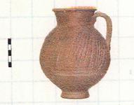 | Description: | Body intact, but chipped and cracked rim. Rounded out-turned lip. Vertical gouging on upper body, slanting towards one side, mid belly with few wheel ridges. Sliced handle with three grooves. Light orange clay. Partial dull slip fired orange to brown, drip on interior. Early 5th c. A.D. | |