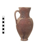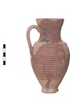 | Description: | Intact except for small chip at rim and chipped foot. Slip very worn. Ovoid body on ring foot, high flaring neck offset at shoulder, plain rim. Rounded lip. Most of body and neck wheel-ridged. Strap handle. Buff clay, dark orange to red glaze (partial). Agora V, L 37. Late 4th c. A.D. | |