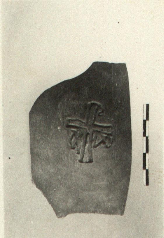 | Description: | The center rises slightly. It is stamped with a cross having a tail, as of a rho, to the right, and beneath one arm Α, the other ω. Red clay, thin red wash. Late Roman C. | |