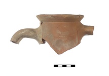 | Description: | Complete rim, part of neck, upper segments of both handles. Mended from four fragments. Slightly everted sharp, squared interior edge wedge rim. Two grooves around base of rim and inset sharply from neck wall. Oval-sectioned handles attached at uneven heights. Pale slip poorly preserved over smooth bright orange fabric. | |