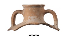 | Description: | Three mended fragments preserving complete rim, neck, both handles and part of shoulder. Squared interior profile wedge rim with flat slightly downsloping top surface: tight, rounded outer edge, concave outer face; slightly and unevenly inset from neck wall. Wide squat cylindrical neck widens somewhat in lower half.Outswung, oval section handles attach over upper half of neck with only a slight rise/arch from neck attachment. Thumb prints at bases of handles. Pale, smooth pinkish slip, micaceous, over orangey core. Resinated, dark brown interior surface. | |
