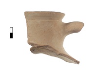| Description: | About one-third of rim with complete neck profile and one upper handle segment. Squared interior profile wedge rim with flat, slightly downsloping top surface sharply inset from neck wall. Wide, squat cylindrical neck. Oval-sectioned handle placed high on neck. Lumpy, pale pinkish gray surface with light surface preserved in places. Greenish resin on interior. | |