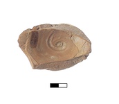 | Description: | Nearly complete toe with start of body wall. Large chip missing from the side. Fairly wide body turns smoothly out to flaring sides of tall disc/proto stem toe with bevelled outer edge. Conical hollow underneath with and small nub. Smooth, micaceous bright orange fabric. | |
