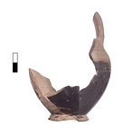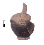 | Description: | Fragmentary small closed vessel reconstructed from six joining fragments. Paint much wear, especially on upper body. Low ring foot; underside flat. Ovoid body, one preserved vertical handle. Paint fired black wherever preserved. Lower exterior edge of foot heavily chipped, but possibly reserved. Remainder of foot and lower body painted solid. Three thin bands on lower shoulder from the uppermost of which springs portion of one preserved cross-hatched triangle. Handle either laddered or barred (too poorly preserved to tell with certainty). Clay, where unaffected by burning, fired close to light brown and pink 7.5YR 6/4-7/4. | |