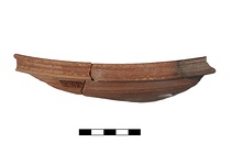 | Description: | Two joining rim fragments (not mended) with burning at one end. Form 3 (Hayes), early variant: shallow rounded wall, low rim with flange below. Shallow spatula-facets on both faces. Red clay; red slip all over, thin on exterior. Phocean Red Slip Ware, 'Late Roman C'. Early 5th c. A.D. Associated with items: P 5436-5439, P 27056 (ca. 425-450). | |