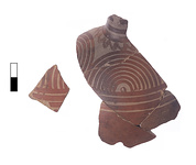 Curved shoulder; narrow vertical neck. Paint mostly fired red, reddish brown. Lower body as preserved painted solid. Three thickish bands on lower shoulder, from the upper most of which spring portions of two sets of mechanically drawn concentric semi-circles, each set comprising eight arcs with small dot at center. Tremulous line above, on uppermost shoulder. Three preserved bands on lower neck.