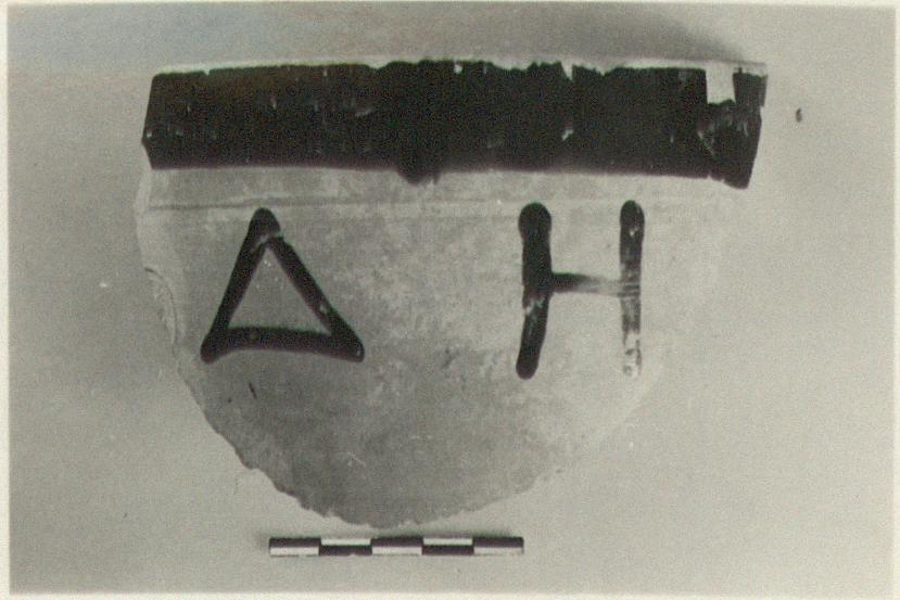 | Description: | Fragment from the top of a cylindrical measure similar to P 3559. Inside, black glaze, carelessly applied, for some distance from the edge. Near the edge the mark of a handle attachment. Outside, black glaze around the top; below, also in black glaze, the letters Δ Η. At the left edge of the fragment, in a circular stamp, the front upper part of an Athena head, with crested helmet. | |
