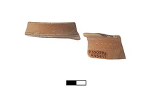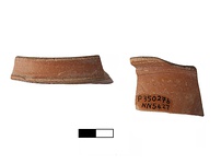 | Description: | Two loose sherds (rim=a, wall=b). Small bowl/dish with upright flanged rim. Ware (similar to Knidian relief ware): orange clay, matte orange slip over all. Probably to be restored as flat based (a type apparently common at Knidos). Context: Mixed to 2nd half to 2nd c. A.D. (with early 1st c. material). Date probably 2nd c. A.D. | |