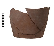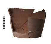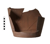 | Description: | Bottom and two-thirds of lower wall preserved. Mended from nine fragments. Flat bottom meeting wall at sharp angle. Floor and two-thirds of interior wall scored with many-toothed comb. Mended in antiquity: four holes for lead clamps drilled along preserved upper edge. Another hole just above floor preserves part of a lead clamp. Gritty clay with many small inclusions; Munsell 2.5YR 6/8 (light red). | |