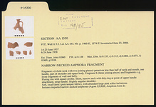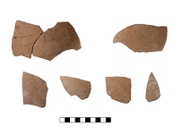 | Description: | Fragment a (whole neck with two joining pieces) preserves less than half of neck and mouth, one handle, part of shoulder and upper body. Fragment b (three joining pieces) and fragments c-g, loose fragments of wall and belly. Flaring rim with square profile. Short, narrow neck with drip ring at point of upper handle attachment, strap handle. Slightly angular shoulder. Soft, local fabric (pink temper fabric), with abundant large pink schist inclusions. Imitates imported narrow-necked amphoras (Agora XXXIII, Amphora form 2). | |