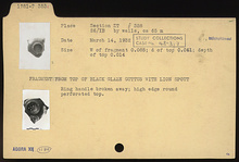 | Description: | Fragment from top of guttus. Ring handle broken away; high edge around perforated top; lion spout. | |