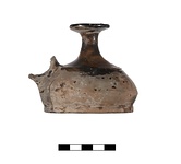 | Description: | Mended from several fragments. Body complete but some body sherds are chipped at the edges, no gaps. Handle attachment preserved. Glaze flaked in large part. Low broad ring foot, flat underside. Low squat body, shoulder offset from body by ridge, tall neck with flat flaring rim slightly warped. Glaze mottled from black to reddish brown. Cf. Agora XII, no. 1192 (P 23037) and no. 1194 (P 6952), 4th B.C. | |