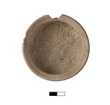 | Description: | Complete but for three chips at the rim. Mended from two large pieces, and a piece of rim. Flat slightly raised base with string marks, bulging wall, flaring rim with small inset for a lid. Unglazed, sandy brown fabric. | |
