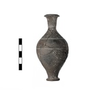 | Description: | Complete except for few gaps in the body. Flat, spreading foot, ovoid body, flaring neck and downturned rim. Gray fabric with two white painted circles at the shoulder and one at join of neck with shoulder. | |