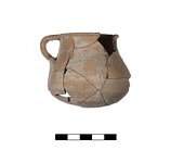 | Description: | Mended from numerous fragments, gaps in body and at rim. Rounded bottom, piriform body, slender shoulder, flaring rim. Short vertical strap handle. Light orange micaceous fabric. Unglazed. Four non-joining fragments and two crumbs in a bag. | |