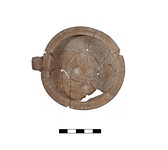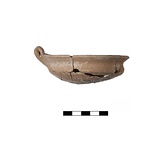 | Description: | Mended from numerous fragments, several chips missing. Gaps in bowl. Shallow bowl, rounded lower body, upper body concave. Flaring rim with subtle flange inside. Small vertical pinched handle. Micaceous light orange fabric. Some burning traces on the underside. | |