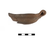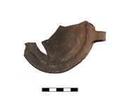 | Description: | One-half preserved with handle. Mended from two fragments. Rounded bottom, wall concave below rim. Deep flange on inside of rim, high loop handle. Micaceous light orange-brown fabric with traces of burning. | |
