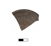 | Description: | About one-quarter of saucer preserved. Lightly concave underside with string marks, concave outer wall, offset rim flattened at top. Center of floor recessed. Light gray-brown fabric. | |
