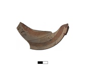 | Description: | About one-quarter of rim with end of one handle and some of the floor. Mended from three fragments. Micaceous light yellow-brown clay with two bands of matte red glaze, one on floor, one on wall. | |