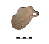 | Description: | Mended from seven fragments, one-quarter of plate with handle preserved. Flat base with string marks, straight wall, pinched handle. Light tan micaceous fabric. Powdery clay. | |