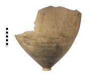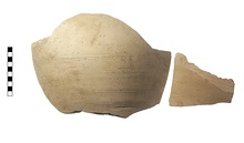 | Description: | Three large fragments (a,b,c) and a smaller joining fragment (d). More non-joining fragments left in tin 717. Toe slightly chipped. a) Whole of base and one side of lower body preserved (five joining fragments). b, c, d) Three body fragments, c and d joined but not mended. Large spreading body. Ring toe with broad flat resting surface, hollowed in the middle. Very smooth brown micaceous fabric (5 YR 6/8). | |