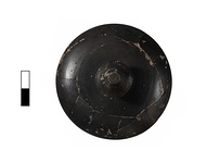 | Description: | Bowl and lid both mended from many sherds. Complete except for a small gap on bowl. Squat lekanis, with low rounded bowl, rim slightly inclined inward above flange, high ring foot. Domed lid with molded knob. Beige fabric. Thin dull black glaze on interior and exterior. Reserved: resting surface and underside, rim of lid. | |
