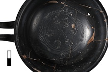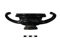 | Description: | Mended from 25 sherds. Complete but for few gaps in the body particularly in handle zone. Moulded foot with scraped groove on exterior and on resting surface both filled with miltos. Underside concave. Molded rim. High swung handles with upwards curving nearly horizontal. Round in section. Interior bottom stamped with six palmettes within six spiral rouletting bands. Buff orangey clay. Good black glaze over all. | |