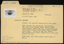 | Description: | Broken but complete except for a few chips. Flat bottom; two horizontal loop handles. The lower body glazed black; above, three black bands. Below the lip, a band decorated with wavy vertical black lines below another black band. On top of the lip, black. The interior all black, except for a line just inside the lip. Buff clay; dull black glaze, quite thin in places. | |