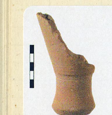 | Description: | Single fragment preserves more than half of toe, with part of lower body. Reddish brown fabric with darker slip, micaceous, with dense packing small to medium pale gray glassy bits. 5 YR 6/6 Fabric. Flaring hoof-shaped toe, inset from body, with conical hollow beneath. | |