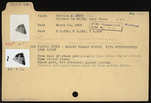 | Description: | From wall of stout pot; probably just below rim of krater. Woman right with outstretched arms. Frontal eye. Fine relief lines. Glazed inside. Indifferent work of severe style. Glaze good but crackled. | |