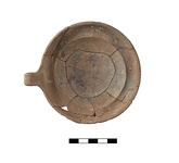 | Description: | Complete but for small gaps. Mended from eleven fragments, traces of burning on interior and exterior. Round bottom, vertical rim with prominent interior flange. Loop handle. Traces of purple pigment in interior. Orange-brown fabric. | |